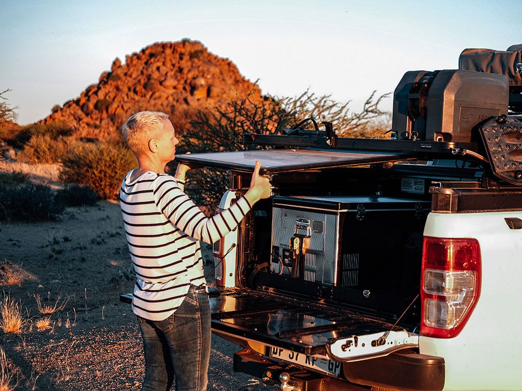 - Les supports peuvent être montés parallèlement ou perpendiculairement aux lattes de la galerie de toit, ce qui permet d’accéder à la table depuis le côté ou l’arrière du véhicule.